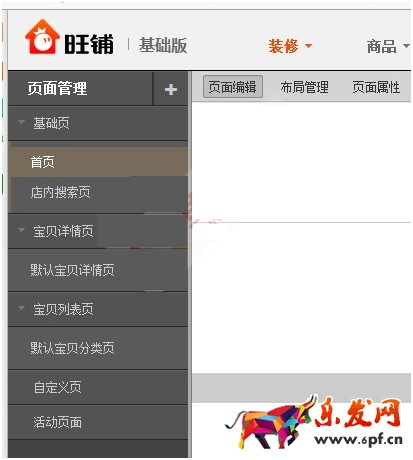 與上述新版旺鋪相比,2012舊版的旺鋪,其裝修后臺(tái)首頁(yè)的頂部旺鋪標(biāo)志背景是灰色的,左側(cè)顯示的內(nèi)容只有基礎(chǔ)頁(yè)、首頁(yè)、店內(nèi)搜索頁(yè)和寶貝詳情頁(yè)等而已。(如下圖所示)