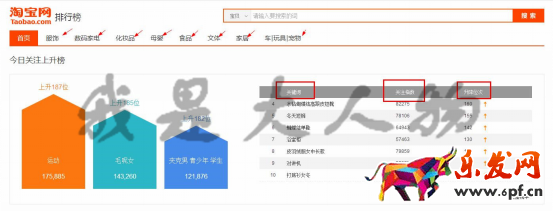 上面截圖是淘寶排行榜,這里可以一目了然的了解到寶貝所在的類目,同時(shí)會(huì)對應(yīng)的提示所在類目寶貝關(guān)鍵詞的關(guān)注度和升降名次,了解當(dāng)日的或者近期一周的排名情況來去提取所要的關(guān)鍵詞,同時(shí)也可以了解類目的排行情況 ,一舉兩得。