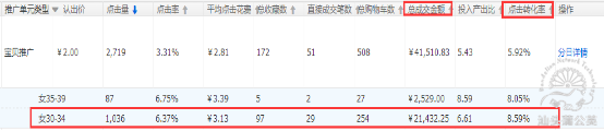 以上為過去30天主推寶貝搜索受眾投放的數(shù)據(jù)情況,由于臨近雙十一,轉(zhuǎn)化會呈現(xiàn)下滑,過去30天的數(shù)據(jù)更具代表性,可以看出”女30-34”人群的投放,通過年齡及客單價的圈定,該人群促進的成交金額多且轉(zhuǎn)化率較高,可以通過人群的溢價比例調(diào)整來提升該人群的流量,人群的圈定有利于提升流量的精準性來促進轉(zhuǎn)化。