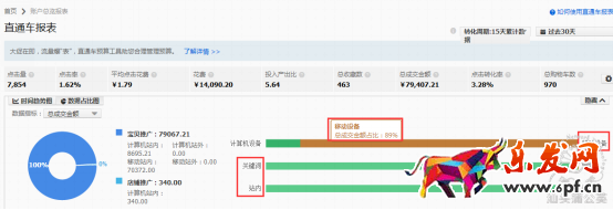 在過去30天,從流量的數(shù)據(jù)占比圖可以看出賬戶的流量主要是來自于無線端站內(nèi)的關(guān)鍵詞引流,無線端的流量占比大,站外、定向及PC端的流量占比較低。