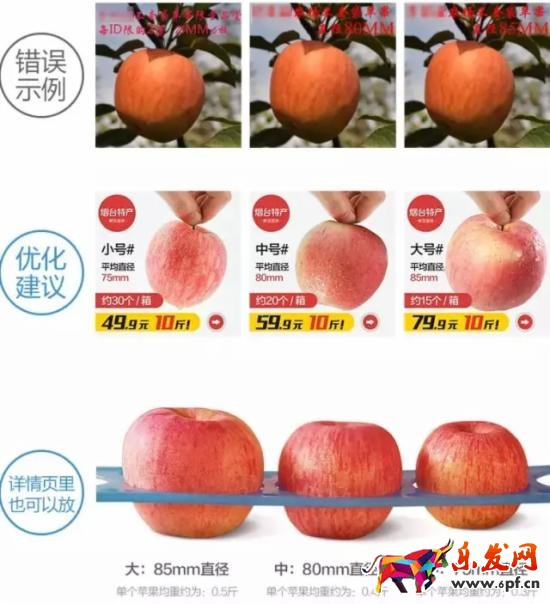 同時(shí)發(fā)現(xiàn)蘋果還分大小號(hào),但是沒有明顯的對(duì)比參照物,更有的甚至直接用了同一張圖代表了,殊不知,這既不方便買家挑選。還讓選擇困難癥的人更加犯難...