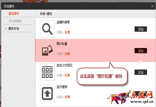 1、進(jìn)入賣家中心——店鋪裝修——點(diǎn)擊添加模塊,如下圖,在基礎(chǔ)模塊中找到圖片輪播,點(diǎn)擊添加。