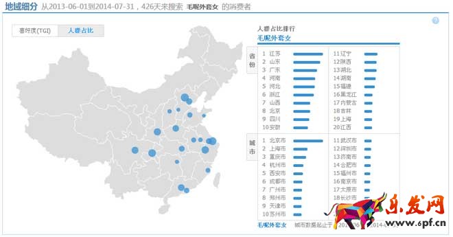 我們繼續(xù),從下圖可以知道喜歡搜毛呢外套女這個關(guān)鍵詞都分布在哪些地方還有人群占比各是多少,這個數(shù)據(jù)適合大家拿去做直通車地域投放,喜好度低的地區(qū)就可以不投放,從而提高直通車點(diǎn)擊率。