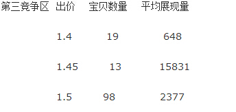 出價0.6的時候 206個寶貝 平均展現(xiàn)189 按照總展現(xiàn)量計(jì)算 38934。例如一個優(yōu)質(zhì)寶貝詞占3W的展現(xiàn)了 剩下的8000多個展現(xiàn)分給剩下的205個寶貝 一個展現(xiàn)30多個 這一算還真的比較符合事實(shí),不信各位掌柜可以看看直通車后臺,那問題來了,都200多個寶貝跑過去沒水喝啦 ,你準(zhǔn)備一個新寶貝也去展現(xiàn)40個嘛。 所以 這就是為什么先看好1.4——1.45區(qū)間 2——2.15的區(qū)間考慮, 那你這同樣還是面臨被優(yōu)質(zhì)寶貝排擠的威脅啊,記住 優(yōu)質(zhì)寶貝會在獲取足夠的流量空間的低價土壤下生長,或者在往上擴(kuò)張,擴(kuò)大市場占有率,出高價。 對于中間價位展現(xiàn)居中寶貝量少的才是新寶貝的首選。 至于精準(zhǔn)的出價多少希望各位親自己測試計(jì)算,價格是浮動的因?yàn)槟憬裉斐鰞r1.4 那你昨天出價的1的位置就會減少,同樣出價1.4的人也會增多,關(guān)注好實(shí)時數(shù)據(jù),按照區(qū)間價位從第三寶貝競爭區(qū)域向第一寶貝競爭區(qū)域靠攏。