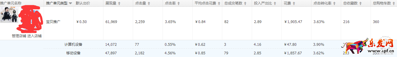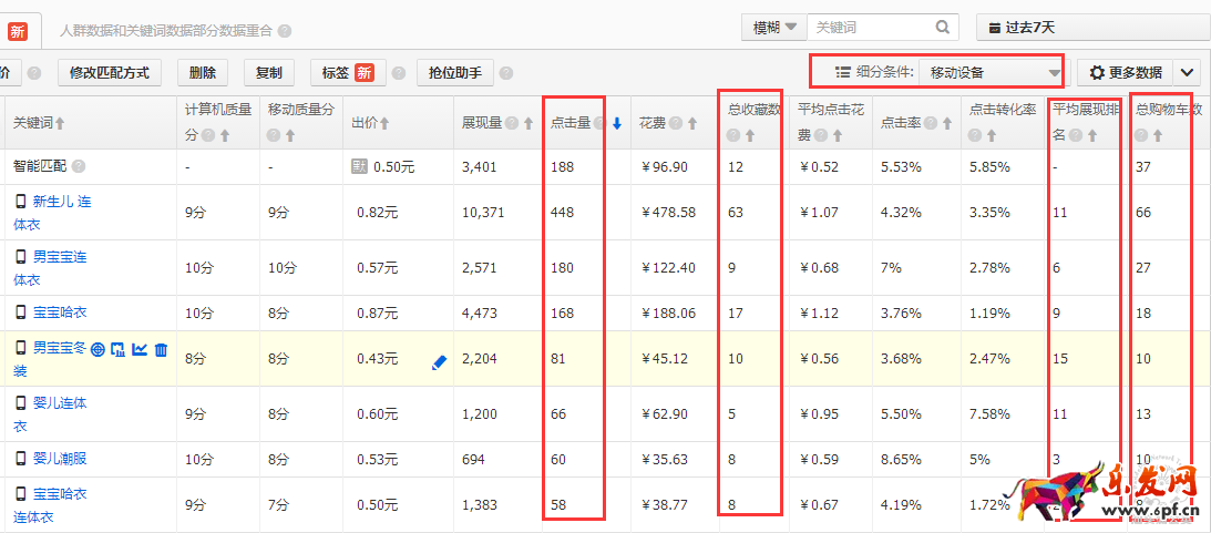 這里舉例講兩個(gè)數(shù)據(jù)維度:收藏率和加購(gòu)率。直通車后臺(tái)的數(shù)據(jù)統(tǒng)計(jì)是沒有幫你計(jì)算得出的,需要根據(jù)數(shù)據(jù)自行計(jì)算。通過以上數(shù)據(jù)可以計(jì)算得出移動(dòng)端的寶貝收藏率為9.76%,加購(gòu)率為16.18%。對(duì)比PC端而言是要高出許多的。再結(jié)合所添加關(guān)鍵詞的情況,找出收藏率和加購(gòu)率相對(duì)寶貝收藏率加購(gòu)率更高的關(guān)鍵詞,在平均展現(xiàn)排名有提升空間的前提下,重點(diǎn)進(jìn)行卡位操作,提升移動(dòng)端競(jìng)爭(zhēng)力,逐步拉升權(quán)重。當(dāng)然,如果想比較省事,也可以直接拉升移動(dòng)端的投放力度,這樣的做法也可以提升移動(dòng)端點(diǎn)擊率,但是可能會(huì)花費(fèi)比較大,建議根據(jù)實(shí)際情況操作。