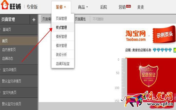 我們先進(jìn)入店鋪裝修頁面,點擊裝修菜單的樣式管理——配色選擇,調(diào)整店鋪整體顏色與裝修顏色一致即可。