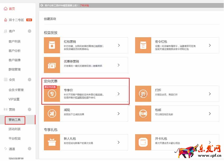 看完數(shù)據(jù)后,是不是有一種迫不及待的想操作的沖動(dòng),要怎樣操作呢? 首先,我們可以看到下圖,在營銷工具里面,有很多的活動(dòng)分類,例如權(quán)益發(fā)放的紅包營銷、密令紅包,又或者定向優(yōu)惠的專享價(jià)、打折、減現(xiàn)等等,下面針對(duì)專享價(jià)進(jìn)行操作。