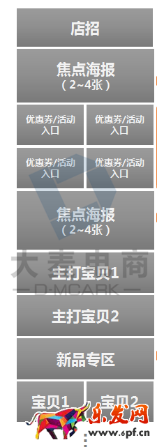 除了文字需要清晰明了外,無(wú)線端首頁(yè)的排版更是要簡(jiǎn)單易懂。在無(wú)線端,由于用戶屏幕較PC端的小,可操作性也相對(duì)低。過(guò)于復(fù)雜的首頁(yè)排版很容易找不到重心,使得我們的主推產(chǎn)品吸引不了用戶的主要,也使得用戶找不到自己想要東西,從而形成跳失。因此,在排版時(shí),我們要注意:促銷信息優(yōu)先展示,主推寶貝排列靠前,分流導(dǎo)航清晰。以下是無(wú)線端首頁(yè)的一般排版方式,以供大家參考: