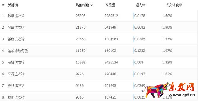 從上圖我們就可以得知連衣裙以下的關(guān)鍵詞搜索指數(shù),商品數(shù)量,曝光率,成交轉(zhuǎn)化率這些大概的數(shù)據(jù),數(shù)據(jù)對(duì)于我知道一個(gè)大概就可以了,因?yàn)閿?shù)據(jù)往往會(huì)導(dǎo)致迷失方向及判斷失誤……你想招聘一名運(yùn)營(yíng),那你作為老板是不是應(yīng)該知道這個(gè)運(yùn)營(yíng)大概的經(jīng)驗(yàn)及案例呢,你不可能會(huì)把他所有的底細(xì)都問(wèn)個(gè)變吧,本來(lái)是一個(gè)不錯(cuò)的運(yùn)營(yíng),結(jié)果你把別人丑事問(wèn)出來(lái)……道理是一樣的。