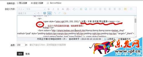 9、輸入需要的文字后,按一下ENTER(回車)鍵,然后再次轉(zhuǎn)到源碼編輯下,找到剛輸入的文字代碼,詳細(xì)見圖。在這個(gè)代碼后面復(fù)制下面的搜索源碼,將下面代碼中 您的店鋪鏈接 替換為自己淘寶店鋪鏈接,店鋪鏈接以http://*****.taobao.com為準(zhǔn),點(diǎn)擊保存就可以了: