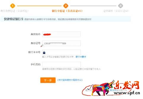 7、銀行卡驗(yàn)證(銀行卡必須綁定手機(jī)號(hào)碼才能驗(yàn)證),完成后點(diǎn)擊下一步