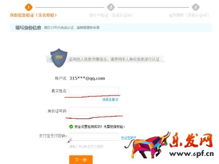 6、進(jìn)入支付寶實(shí)名認(rèn)證流程,首先驗(yàn)證身份信息,填寫(xiě)真實(shí)信息,點(diǎn)擊下一步