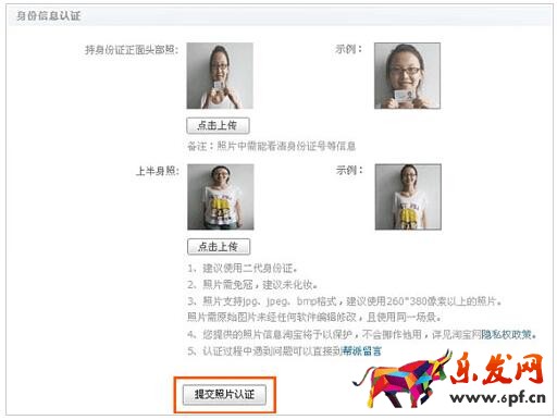 二、“淘寶身份信息認(rèn)證”需要提交:一張手持身份證正面頭部照和一張上半身照,點(diǎn)擊上傳;