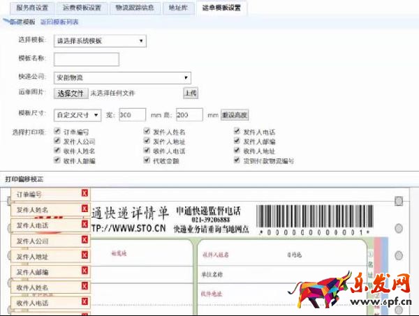 5.運(yùn)單模板設(shè)置:點(diǎn)擊新增模板,出現(xiàn)如下所示頁面,這個(gè)和服務(wù)商設(shè)置是有聯(lián)系的,如果我們和快遞公司有合作,在這里就可以進(jìn)行訂單編號(hào)、發(fā)件人姓名、電話等操作保存。