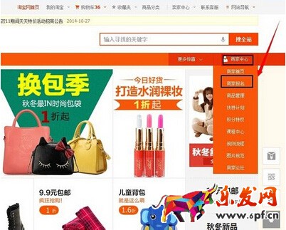 跟著將鼠標移動到右邊的“商家中心”,如下圖所示,我們看到一個下拉列表,點擊上面的“商家報名”。