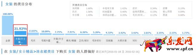 3、女裝近30天的類目分布情況數(shù)據(jù)顯示,占比較大的是:女裝/女士精品>連衣裙類目 ,其次是毛衣類目,外套類目等。