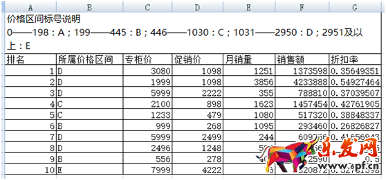 在這里我們?yōu)榱耸r間,所以僅僅提取了十個數(shù)據(jù),實際操作的過程中,你至少要搞定第一頁的數(shù)據(jù),實際上我們甚至建議搞定前兩頁的數(shù)據(jù)!為了方便統(tǒng)計,我們對價格區(qū)間(來自于淘寶搜索)進行了標號列示。然后銷售額的計算是銷量*促銷價,折扣率的計算是促銷價/專柜價