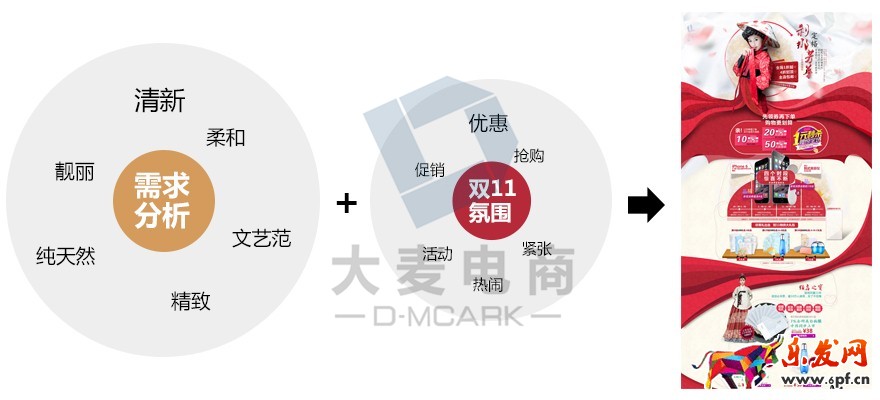 當看到要先為頁面定位時,相信很多人都納悶了,“雙11定位還要多想嗎,肯定是促銷、喜慶啦”。當然,促銷和喜慶是固然的,也是我們雙11活動的主要基調(diào)。然而,要從千軍萬馬中先拔頭籌,我們一定要靜下心來,理性分析店鋪的定位與用戶需求,盡可能將這些需求通過具象的詞表現(xiàn)出來。并與雙11的促銷氛圍有機的結(jié)合,形成有店鋪特色,有情感的雙11落地頁,在滿足用戶想要優(yōu)惠的理性需求的同時滿足用戶的情感需求。