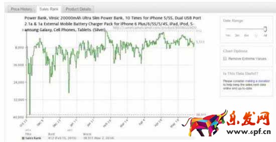 可查到這個產(chǎn)品在歷史上所有的價格數(shù)據(jù),此案例是從2014年10月23日開始上線,價格是$50,然后又嘗試定到$60,經(jīng)過幾次波動,在15年開始至今,價格都相對平穩(wěn),都在50的水平。作為新產(chǎn)品,除了參考競爭對手水平,也要自己多番測試,才能找到一個最有利于銷量的黃金分割點(diǎn)。關(guān)于定價的策略,后面我可能會寫一篇這個話題的文章。Date Range板塊有些歷史比較舊的listing,由于太多數(shù)據(jù),所以當(dāng)需要時可調(diào)成最近6個月的,甚至1個月的,以便得出更詳細(xì)的數(shù)據(jù)。默認(rèn)是歷史所有,All。Price Type板塊綠色的Amazon,就是Amazon官方銷售的產(chǎn)品,極少數(shù)的情況可能會需要調(diào)查Amazon官方,大部分我們的競爭對手還是第三方賣家居多。藍(lán)色的3rd Party New, 一般默認(rèn)的都有這個,基本上我們都是第三方賣家。紅色的3rd Party Used, 這個基本不用,主要是賣二手貨的第三方賣家,基本上只有美國本土才會有人賣二手的,國人的幾乎沒有,可忽略。所以在下面的三個tab,一般我們默認(rèn)只有藍(lán)色的3rdParty New.Sales Rank板塊