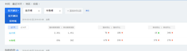 百度和淘寶雖然不是一家的但是百度搜索的數(shù)據(jù)是能從一方面去反映出消費(fèi)者的需求的。那首先搜索“連衣裙”和”半身裙“兩個(gè)詞的對(duì)比。