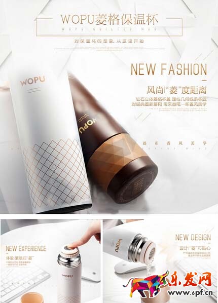 將產(chǎn)品賣點進(jìn)行文案的提煉,統(tǒng)一出能貫穿所有賣點的關(guān)鍵字,再進(jìn)行潤色處理,如下圖將產(chǎn)品的賣點“風(fēng)尚‘菱’度距離”、”體驗繁瑣歸‘菱’“、”設(shè)計‘菱’巧貼心“,很好地將杯型的菱格與每個賣點進(jìn)行文案的結(jié)合,巧妙且恰到好處。