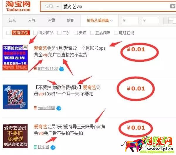 當(dāng)然,你肯定是競(jìng)爭(zhēng)不過(guò)這些大店鋪的。有人會(huì)問(wèn):憑什么你發(fā)布商品就會(huì)有好的排名?這個(gè)問(wèn)題問(wèn)的好。這不是很多排名規(guī)則嗎?很多買(mǎi)愛(ài)奇藝會(huì)員的會(huì)想著買(mǎi)最便宜的,那不是有個(gè)價(jià)格從低向高排嘛。我再給你搜一遍,竟然有0.1元的,而且只送不賣(mài)的,現(xiàn)在愛(ài)奇藝vip會(huì)員引流真是一招更比一招狠啊。這根本不是來(lái)淘寶做生意的,這是來(lái)淘寶搶流量的。他們送你會(huì)員干嘛?讓你加他好友或者微信或者加群啊。想想一大波小白火急火燎的來(lái)?yè)屵@個(gè)免費(fèi)的vip,我就一個(gè)字,服。