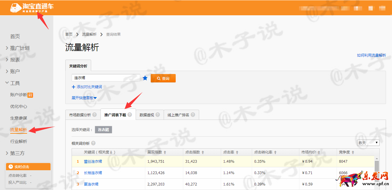 這里也在推廣詞表中提供了的關(guān)鍵詞,流量解析工具頁(yè)面輸入相關(guān)類目,如連衣裙,在關(guān)鍵詞詞表下載區(qū)塊中,可以看到關(guān)鍵詞或者類目相關(guān)詞表下載,點(diǎn)擊下載按鈕,下載excle表格中保存。