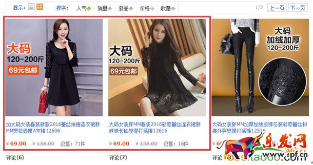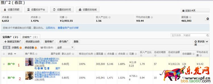 分析:如上圖,紅色方框的這2款寶貝,在銷量和人氣上,都是屬于店鋪中是較高的,同時寶貝是新品應季的春款寶貝,同時在寶貝的詳情頁上,細節(jié)圖與模特展示圖都較為全面,適合在直通車上進行推廣測試。