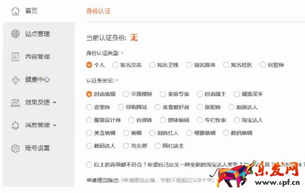 第二步:點擊之后,會出現(xiàn)“身份認證”,然后勾選身份認證類型:個人,認證身份名:時尚編輯(視個人情況來選擇)
