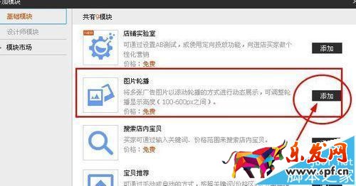 3、進入后有三種選擇。第一個,基礎模塊。意思是系統(tǒng)自帶的模塊,包括輪播、自定義內容區(qū)、寶貝推薦等等常用模塊,都在這里。選擇好自己需要的模塊,點,添加。