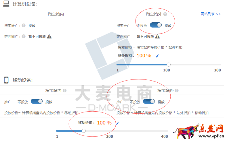 針對上面的情況,我們第一步先把PC和無線的站外平臺關(guān)閉,如果定向推廣能開啟的店鋪也建議先關(guān)閉,一般來說,這三個投放平臺總體上相比站內(nèi)的點擊率會比較低,如果開啟會整體拉低整個計劃的點擊率。由于現(xiàn)在的無線端點擊率要比PC端的要總體高出不少,所以無線折扣方面暫時拉升到150%,如下圖。