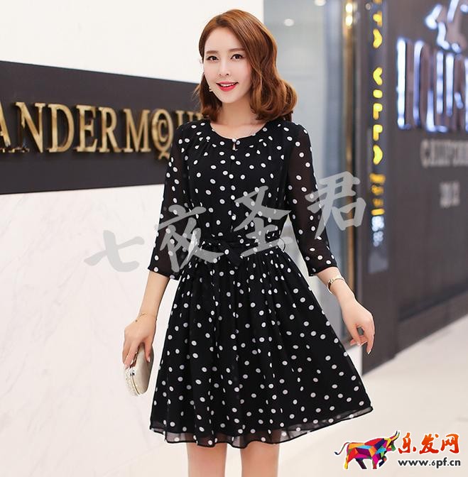夏季新款圓點七分袖荷葉邊雪紡連衣裙 通勒淑女圓領(lǐng)蝴蝶結(jié)中裙