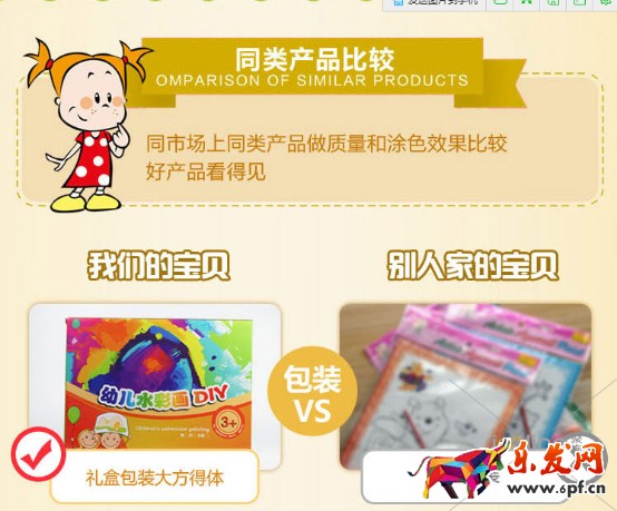 還有要注意的就是咱們的寶貝詳情頁的問題,掌柜詳情頁做的還是比較好的。詳情頁把咱們的優(yōu)惠信息再次傳遞給客戶,還有寶貝的細(xì)節(jié)問題。還有水彩畫的分類也做得很好。也和其他家的做了一個(gè)對比的。還要從咱們的詳情頁跳出率、流量、轉(zhuǎn)化率看咱們的寶貝適不適合推廣。