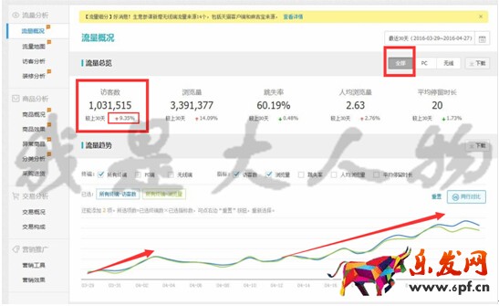 2、整體訪客情況較上一周期,呈上升趨勢,同時根據(jù)不同端口,了解目前店鋪的流量主要是哪部分占比較大,以及是店鋪的核心流量: