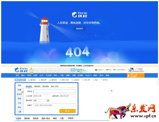 打開攜程官網(wǎng),頁面顯示404出錯,返回首頁后只能進(jìn)入其官網(wǎng)首頁,當(dāng)中鏈接及多項功能均無法使用。