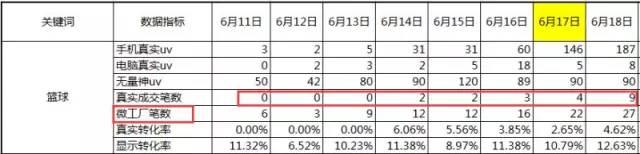 重點,如果這個時候你開了直通車,江湖策的數(shù)據(jù)有可能影響,操作時要注意。例如:這個店鋪才接手1周,之前他們有開車,有個“耐克籃球”這個關(guān)鍵詞,但是標題里沒有耐克籃球關(guān)鍵字,然后我一看是直通車的 那你刷耐克籃球,是正常排名找不到的 標題沒有)