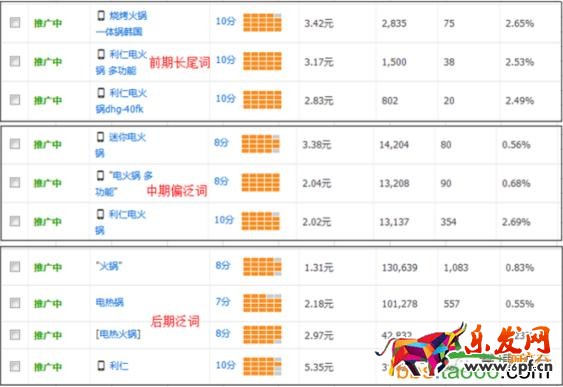 (1)添加偏泛詞(質(zhì)量得分較高,出價略低于精準(zhǔn)詞20-30%,測試偏泛詞反饋);
