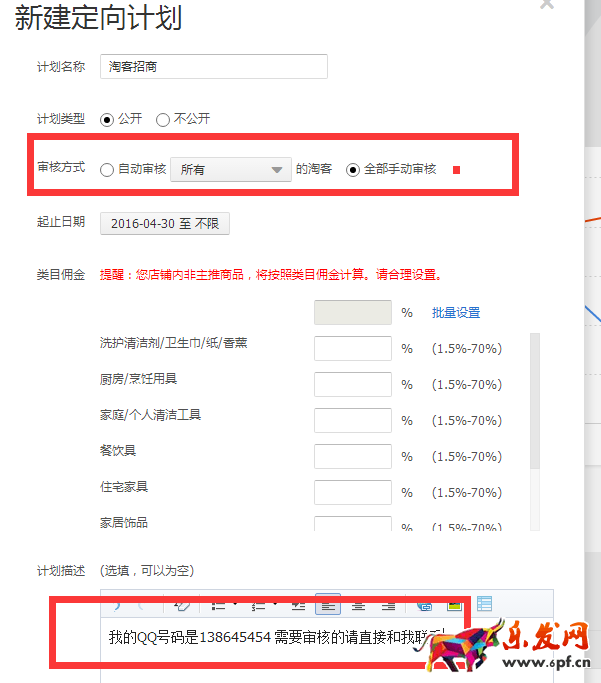 1、就是剛才說的,開個公開計劃,設置手工審核,然后上面寫上聯(lián)系方式,讓淘寶客來聯(lián)系你。