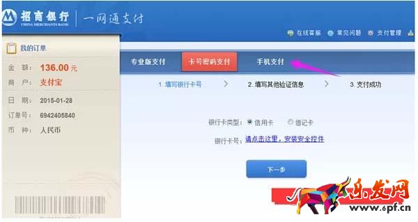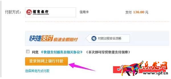 2.選擇付款,先選擇用網(wǎng)上銀行支付,也可以是招商銀行信用卡付款,這里只是在測試對方是否是騙子,如果不是在用回自己的網(wǎng)銀付款。(如下圖)