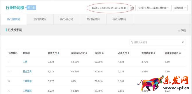 我們這里選取核心關(guān)鍵詞五金工具/工具組套/工具套裝三個關(guān)鍵詞,然后將我們選取的3個核心這里先保存,繼續(xù)打開我們生意參謀的搜索詞查詢,將剛才幾個詞手動輸入搜索查詢,如圖: