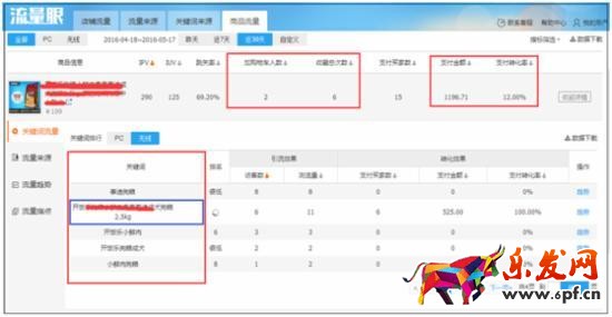 按照IPV排序后,從上到下開始分析,點(diǎn)擊“流量詳情”,這個(gè)寶貝流量的基本情況就會(huì)展現(xiàn)出來。我們看一下這個(gè)寶貝,支付轉(zhuǎn)化率12%,有一些流量進(jìn)來,但是排名都很低,然后我們?cè)倏匆幌?ldquo;流量指點(diǎn)”
