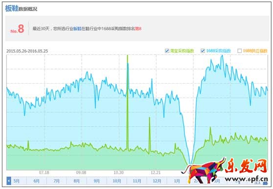 綠色是淘寶采購(gòu)指數(shù),基本代表了淘寶+天貓上面消費(fèi)者的需求。我們可以看到整體的趨勢(shì),從5月份一直到1月中旬,這個(gè)板鞋的需求都是非常穩(wěn)定的,1月中旬到2月中旬的時(shí)候,是一個(gè)下滑期,但是考慮到,這個(gè)期間是春節(jié)期間,春節(jié)前后,每一個(gè)行業(yè)的銷量下滑都是非常正常的,所以從這個(gè)意義上來講,這個(gè)類目一年都是非常穩(wěn)定的。更為關(guān)鍵的時(shí)候,大家看16年的5月份淘寶的采購(gòu)指數(shù)同比15年是上升了,也就是說這個(gè)行業(yè)整體在上漲,這是一個(gè)不錯(cuò)的積極信號(hào)。