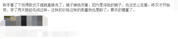 曾經(jīng)操作過的一個(gè)店鋪,因?yàn)槌霈F(xiàn)了一個(gè)追評(píng)差評(píng)在第一屏?xí)r候,轉(zhuǎn)化率從原來(lái)的3%的轉(zhuǎn)化率降到0.5%。這個(gè)事情告訴大家是注意店鋪里面的一些小細(xì)節(jié)。很多人的店鋪除了出現(xiàn)差評(píng)會(huì)主動(dòng)電話去聯(lián)系客戶修改,之后并沒有針對(duì)的對(duì)于一些雖然好評(píng)可是出現(xiàn)不好的評(píng)價(jià)做出解釋,如圖下,雖然客戶好評(píng)了,可是評(píng)論說這個(gè)褲子掉色嚴(yán)重,大家都知道褲子最害怕的就是掉色問題,可是賣家看到這個(gè)評(píng)論不去解釋,是不是大大影響到了你這個(gè)寶貝轉(zhuǎn)化率呢。