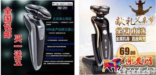 左圖----“螞蟻”般的字誰能告訴我是什么?你是在羅列寶貝買點嗎?這效果往往更會讓人頭疼,還有所謂的“買一送五”只要是經常在淘寶購物的,都知道你這送五的含義,無非是一些清洗毛刷、布藝便攜袋,額外內置刀頭,然而并沒有什么亂用,這些都是寶貝的一致標準配件,并沒有達到你想要的“巨優(yōu)惠”效果。