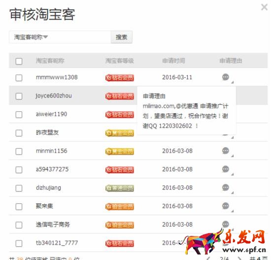 以上均為最基礎的操作,設置自建定向計劃以后,你就可以知道淘客的ID,以及旺旺ID。如果是手動審核計劃,你可以看到淘客的留言(申請理由),有很多會留下聯(lián)系Q, 個人一般不會去加(水比較深)。有了這些,你就可以聯(lián)系到淘客了。