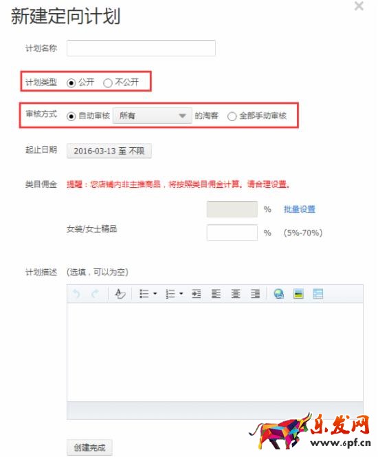 自建定向計劃,有公開和隱藏之分。這邊就不詳細說明,官方都有講解。定向計劃也可設置為手動審核和自動審核。我通常兩種都會分別做一個。自動審核的傭金會比通用計劃的傭金設置的要高。手動審核的傭金我會設置的最高。原因很簡單,手動審核里面的都是長期合作的優(yōu)質淘客。這里只是個人的一個操作習慣。每個人的操作手法不同。