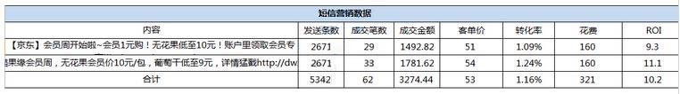 本次短信一共發(fā)了2波,花費(fèi)321元,成交3274元,轉(zhuǎn)化率1.16%。