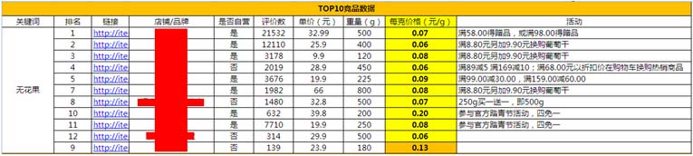 優(yōu)化之前,我先把【無(wú)花果】類目行業(yè)排名前10的產(chǎn)品做了一個(gè)簡(jiǎn)單的調(diào)研分析: