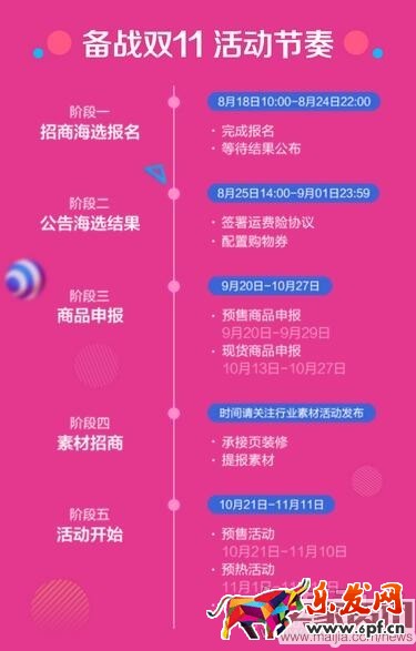 小編了解到,天貓2016年雙11即將進(jìn)入商家預(yù)售商品申報(bào)階段,通過(guò)雙11海選結(jié)果的商家還需陸續(xù)進(jìn)行現(xiàn)貨商品申報(bào)、素材提交等,最終于10月21日開(kāi)始雙11預(yù)售。