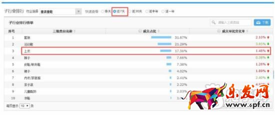 因該商家沒有套裝和運動鞋,初定上衣、褲子這兩個品類可推,而上衣品類在最近30天處于上升趨勢,環(huán)比變化率0.71%,近7天環(huán)比變化1.48%,由此可見上衣品類屬于上升態(tài)勢,是可以推爆的。